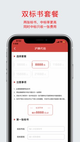 3、除了丰富的代拍团队选择外,上海沪牌代拍App还提供了标书套餐。