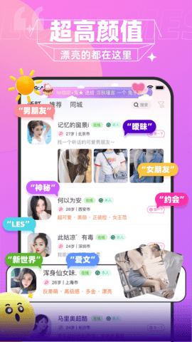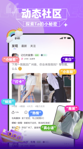 4、同时它还提供了丰富完善的甜蜜标签功能,实时活跃及同城的列表功能。