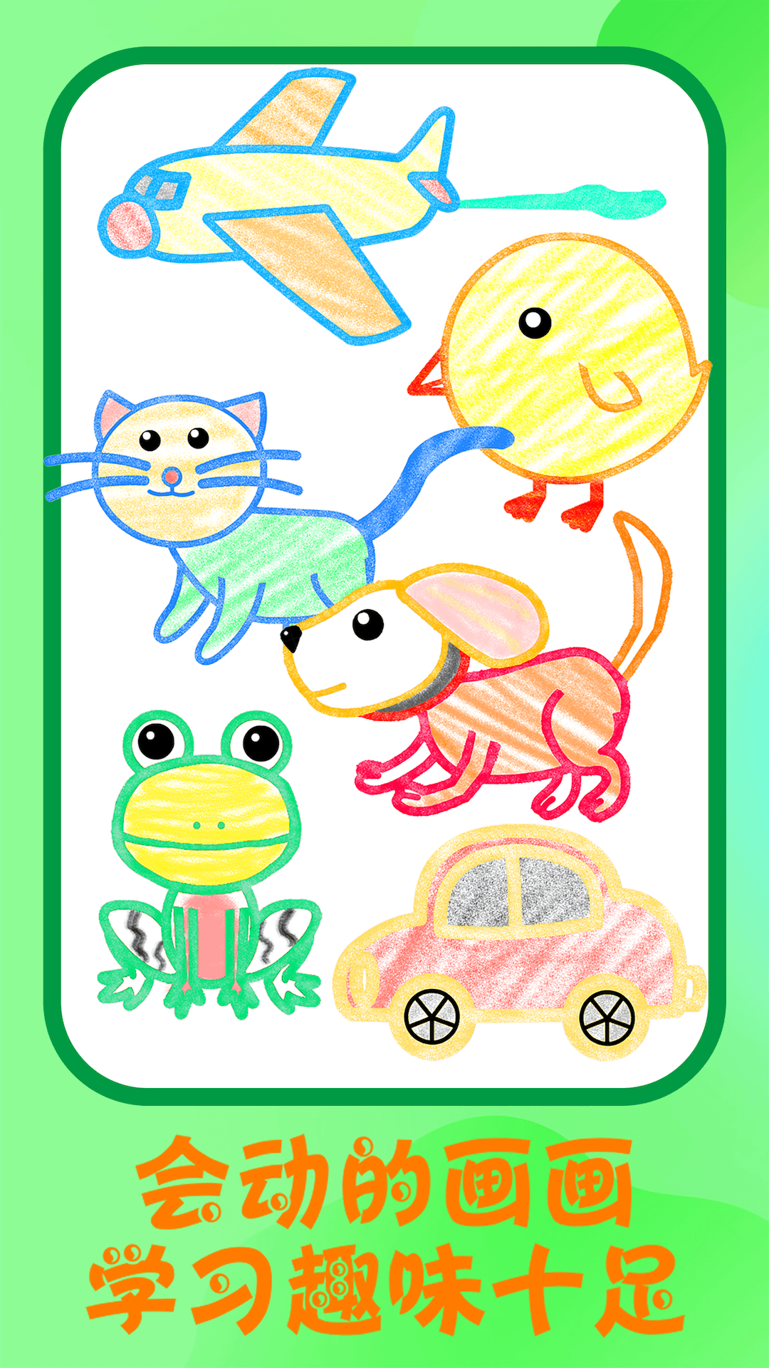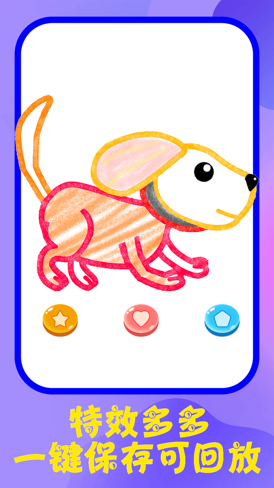 3、在绘画模式中,宝贝们可以循环渐进地画出一个又一个可爱的角色,比如青蛙、小汽车、小狗等等。