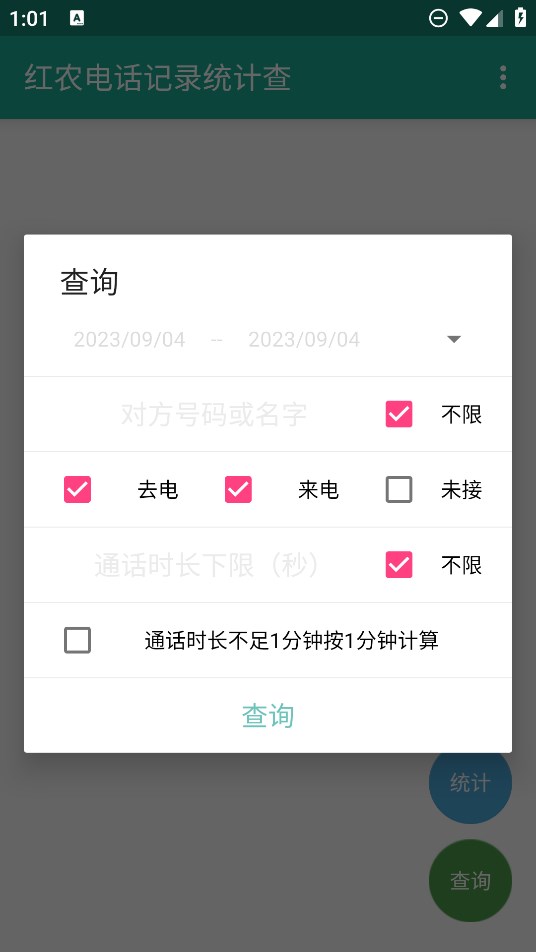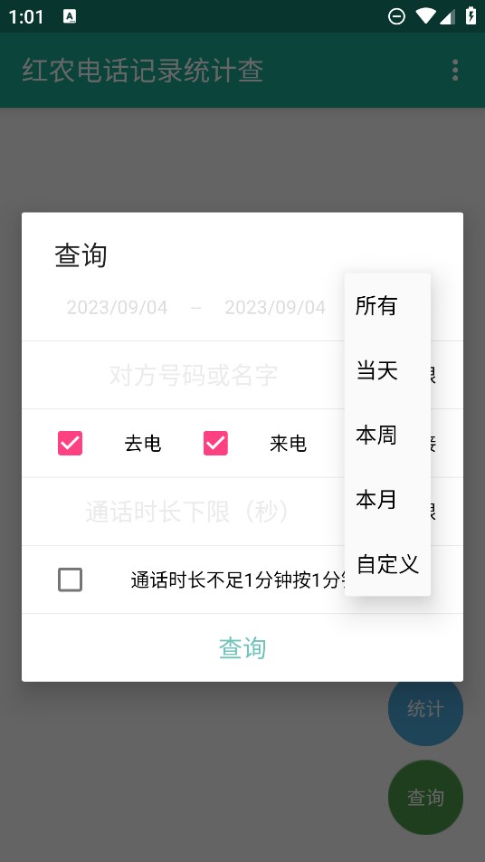 3、例如,用户可以选择查询去电或未接,并选择通话时长,甚至可以自定义勾选通话时长不足1分钟按1分钟计算。