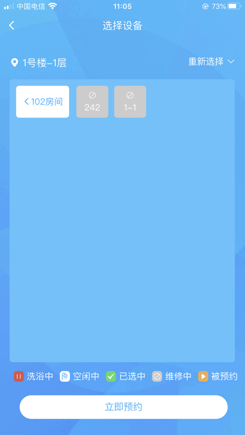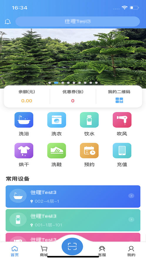 2、现在就立即打开该软件,并进入首页,查看余额和设备选择页面,挑选设备并立即预约。